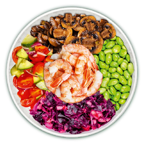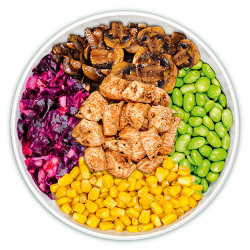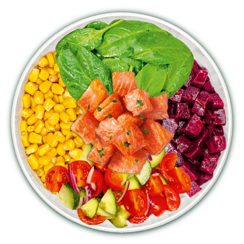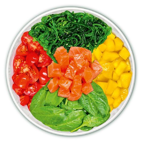 Protein: Lachs, Hähnchen, Tofu (aufgrund der Marinade, gerne bei der Bestellung „unmariniert“ dazuschreiben)